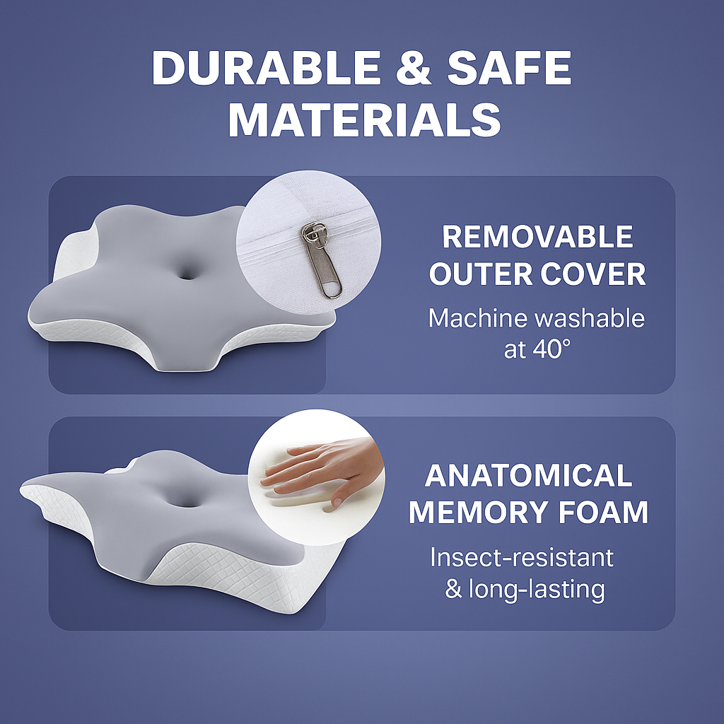 Nuvora Ergo Pillow is made from high-quality memory foam, free from harmful chemicals. Hypoallergenic and durable, it provides a healthy sleep environment while maintaining long-term comfort and support.